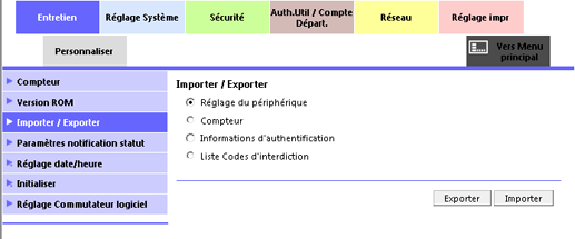 Divers réglages de cette machine peuvent être enregistrés (exportés) vers un ordinateur. Cet écran est disponible quand vous voulez sauvegarder divers réglages de cette machine ou appliquer le même réglage à plusieurs périphériques.