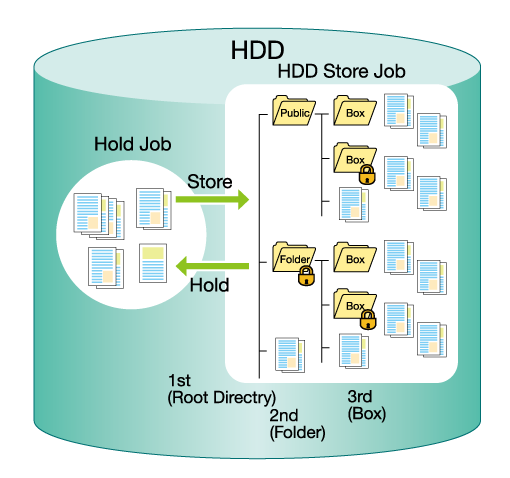 Sowohl gehaltene Jobs als auch HDD-Speicherjobs werden auf der Festplatte des Systems abgelegt und bleiben auch nach dem Ausschalten des Systems gespeichert.