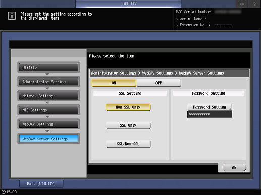 [Configración SSL] | [Sólo no SSL] | Permite la comunicación solo cuando la comunicación SSL está desactivada en los casos en que el sistema se utiliza como servidor WebDAV. |