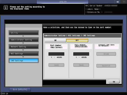 [Conectar IWS Apps a la red] | Configure los ajustes para permitir el reenvío de la aplicación de conversión de datos de impresión al sistema. Si se permite, se podrá utilizar la función de conversión de datos de impresión. |