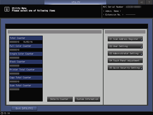 Al pulsar Utilidades/Contadores en Panel de control, aparece la pantalla [UTILIDAD], donde podrá seleccionar el siguiente menú de configuración.
