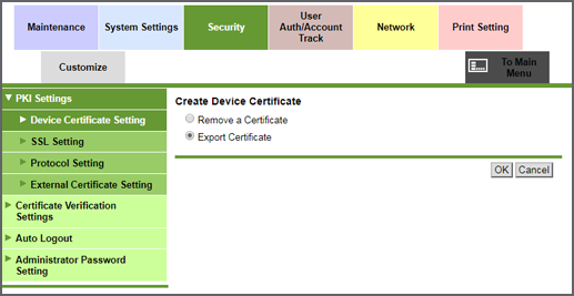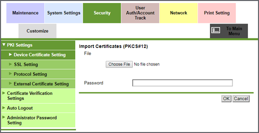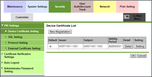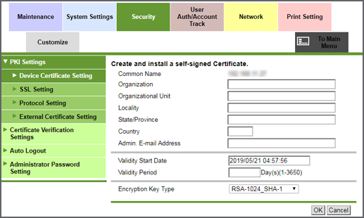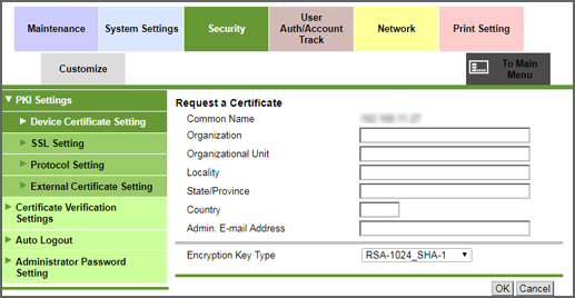 [Organización] y [Unidad de organización]: se pueden definir utilizando un máximo de 63 caracteres de un byte. [Localidad] y [Estado/Provincia] pueden especificarse usando un máximo de 127 caracteres. Para [País], defina el código de país indicado en ISO3166 con 2 caracteres de un byte.