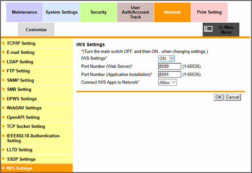 [Connect IWS Apps to Network]* | [Permitir] | Permite transferir la aplicación de conversión de datos de impresión. |