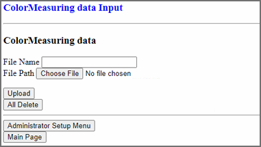 [Upload] | Carga los datos colorimétricos seleccionados. El archivo se puede cargar en las siguientes condiciones. Tamaño de archivo: máximo 300 KB Número de elementos: 100 |