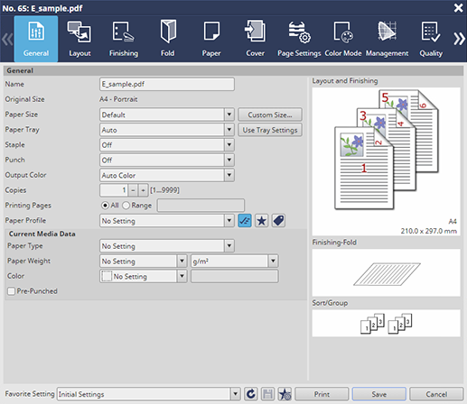 Cette fonction permet d'appliquer et d'imprimer le contenu défini ou d'enregistrer une configuration d'impression en tant que configuration favorite.