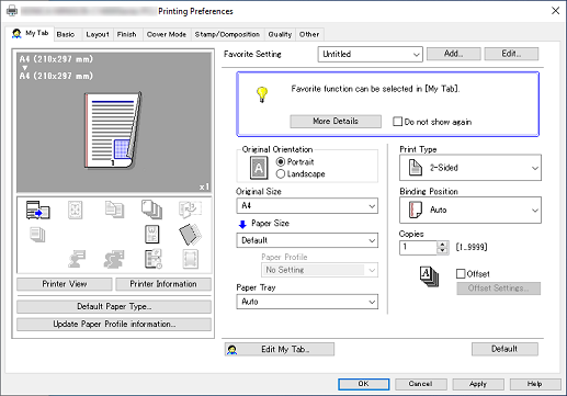 [My Tab] | Permet de disposer librement différents éléments de réglage dans d'autres onglets de ce pilote d'imprimante. |
