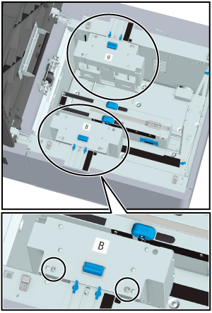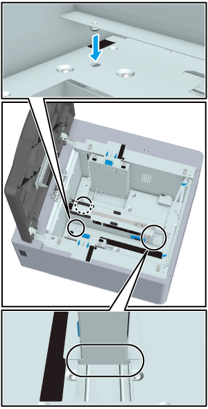 Installez-la de sorte que les trous d'installation du Guide auxiliaire latéral correspondent aux vis de positionnement des Guides latéraux.