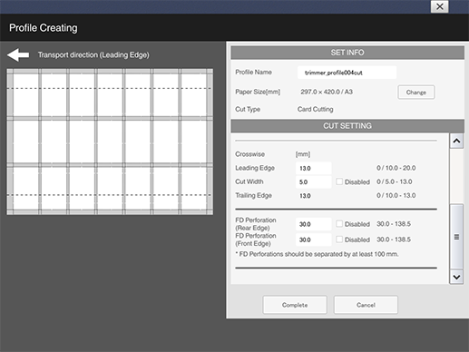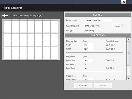 Définissez un profil massicot pour [Card Cutting]. Vous pouvez configurer les dimensions finales et la position de coupe.