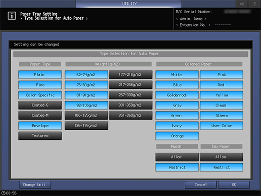 [Perforation] | [Autorisation] | Sélection autorisée du magasin papier contenant du papier perforé. |