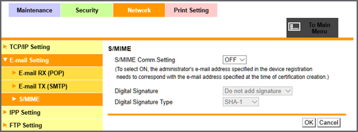 [Réglages comm.S/MIME] | [ON] | Utilise la communication S/MIME. Pour sélectionner cet élément, l'adresse e-mail de l'administrateur spécifiée lors de l'enregistrement du Contrôleur d'image doit correspondre à l'adresse e-mail spécifiée lors de la création du certificat. |