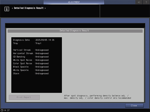 Ce système peut exécuter un diagnostic pour trouver les causes de divers défauts sur les images comme des lignes et des taches (contours blancs et couleur, taches et marques noires et blanches) avec la fonctionnalité [Diagnostic des images]. Vous pouvez ensuite procéder à divers réglages au vu des résultats du diagnostic en vue d'améliorer la stabilité de la qualité image.