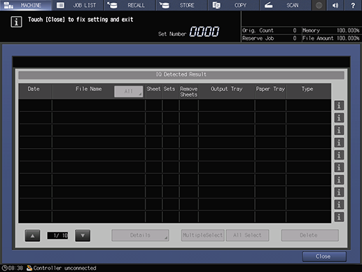 [Rim. fogli] | Visualizza il numero di fogli da rimuovere dalla carta in uscita in cui è stato rilevato un errore. Per informazioni dettagliate sul metodo di rimozione, fare riferimento si messaggi in [Risult.rilevam.IQ]. |