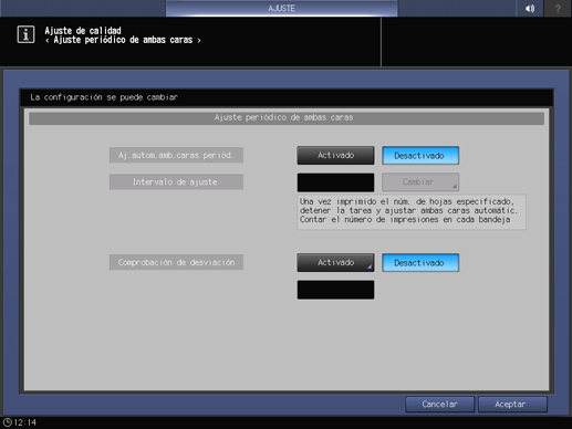 Intervalo de ajuste | Especifique el intervalo para ajustar automáticamente ambas caras. | Si selecciona Activ. para Aj.autom.amb.caras periód., , puede pulsar Cambiar para especificar entre 100 y 9999 hojas. (Valor predeterminado: 500 hojas) |