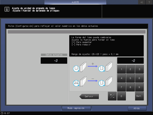 Con esta función puede ajustar el valor de referencia de la fuerza para formado de esquina de lomo (Fuerte+, Fuerte, Normal, Débil o Débil+) que se debe especificar en la pantalla COPIAR o con el controlador de impresora.