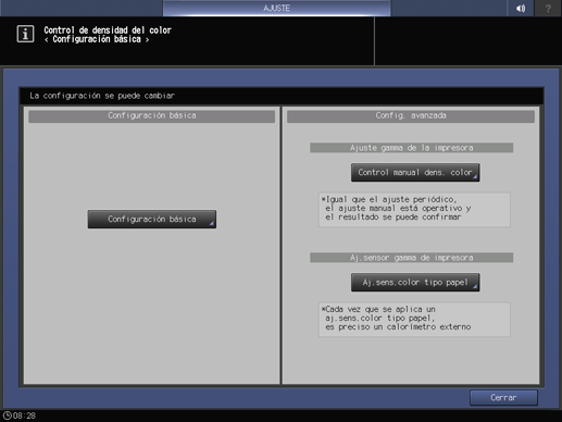 Si utiliza la función de control de densidad del color (Ajuste del sensor de color para cada tipo de papel / Control manual de densidad del color), ajuste siempre el parámetro Usar contr. man. dens. color al valor Activ.
