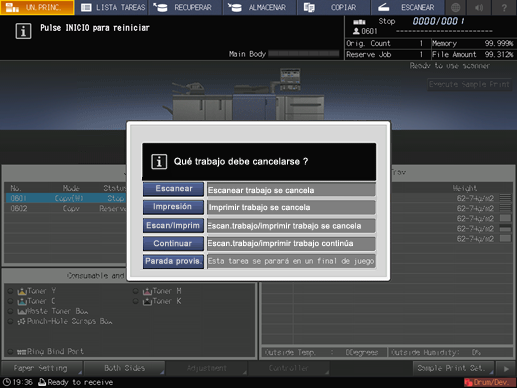 La operación actual de la máquina del trabajo seleccionado se suspende y se visualiza un diálogo.