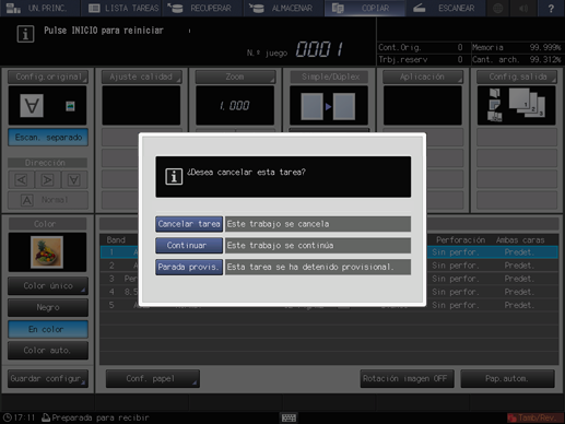 explicación adicionalPulse Parada provis. para suspender la tarea. Cuando la tarea está suspendida, es posible cambiar algunos ajustes. Pulse Inicio en el panel de control para reanudar la tarea.