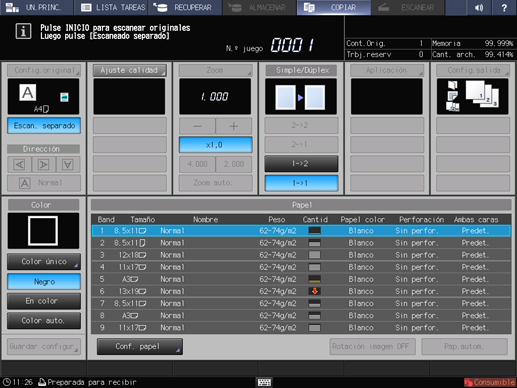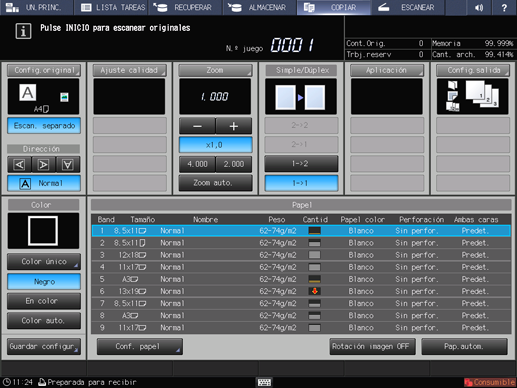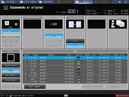 Se activa el modo Escan. separado. Si esta tecla ya aparece resaltada, significa que el modo Escan. separado se ha activado automáticamente según las condiciones de copia seleccionadas.