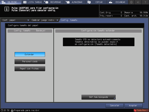 Si selecciona Estándar la máquina detecta automáticamente el tamaño de papel estándar cargado en la bandeja.