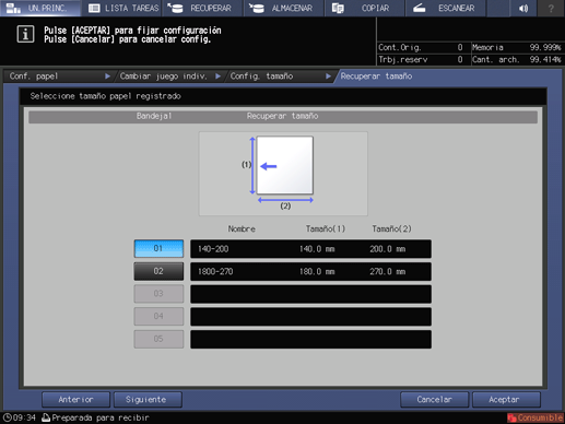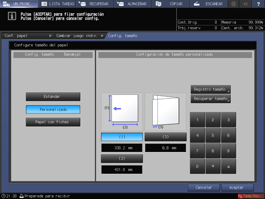explicación adicionalDespués de introducir el valor, pulse Registro tamaño. Aparece la pantalla Registro tamaño.