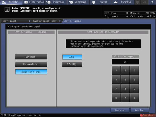 Si selecciona Papel con fichas, aparece la pantalla Configuración de separador.