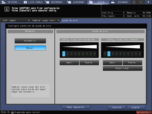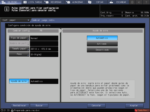 Si selecciona entre Bandeja1 y Bandeja9 en la unidad de alimentación de papel PF-707m o en la unidad de alimentación de papel PF-711 en el paso 5 y después pulsa Ayuda de aire, se muestra la pantalla Ayuda de aire siguiente.
