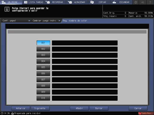 explicación adicionalPara cambiar el nombre de color especificado, pulse Intr.nombre color para visualizar la pantalla Introducir nombre del papel de color y cámbielo.