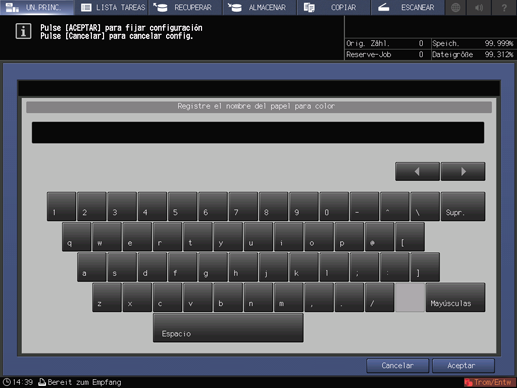 Pulse Color de usuario. Se visualiza la pantalla Introducir nombre del papel de color.