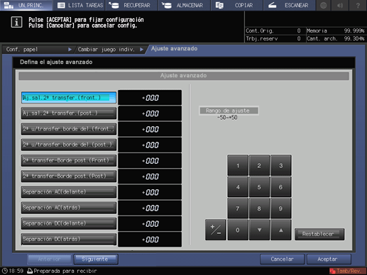explicación adicionalSi pulsa Reiniciar podrá cambiar del valor de ajuste actual al valor predeterminado de la máquina.
