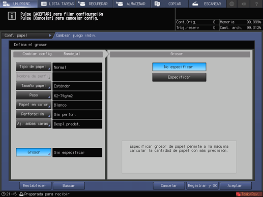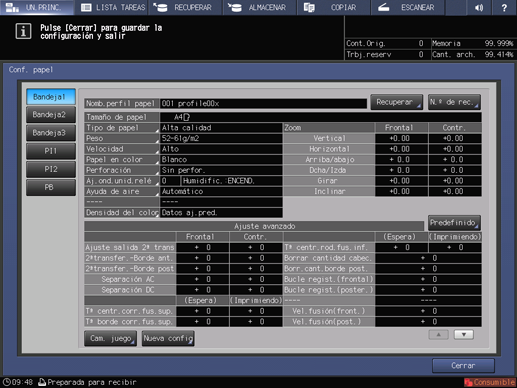 explicación adicionalAjuste avanzado no se visualiza en la configuración predeterminada. Para realizar el ajuste avanzado desde la Conf. papel que aparece en las pantallas UN.PRINC. o COPIAR, póngase en contacto con el servicio de asistencia técnica.