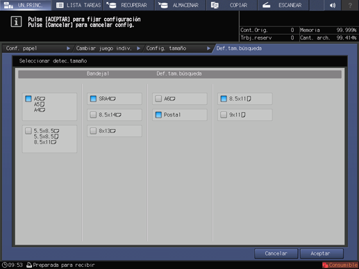explicación adicionalSin embargo, hay un grupo de tamaños de papel que la máquina no puede distinguir porque son bastante similares entre ellos. Es necesario identificar manualmente al menos un tamaño que la máquina pueda detectar.