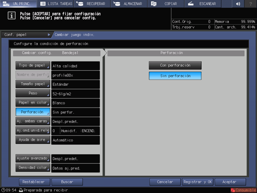 Seleccione Con perforación cuando cargue hojas con orificios de encuadernación y seleccione Sin perforación cuando cargue hojas sin orificios de encuadernación.