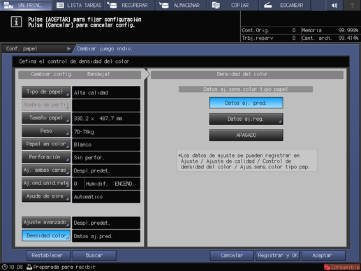 explicación adicionalCon Datos aj. pred. seleccionado, la máquina ejecuta la corrección gamma (control de densidad de color) según los datos de ajuste predefinidos en la máquina.