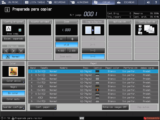 explicación adicionalCada línea muestra Tamaño, Nombre, Peso, Cantid, Papel de color, Perforación y Ambas caras para cada bandeja. En Nombre se incluye generalmente el tipo de papel o un nombre de perfil registrado previamente que representa un conjunto de especificaciones del papel.