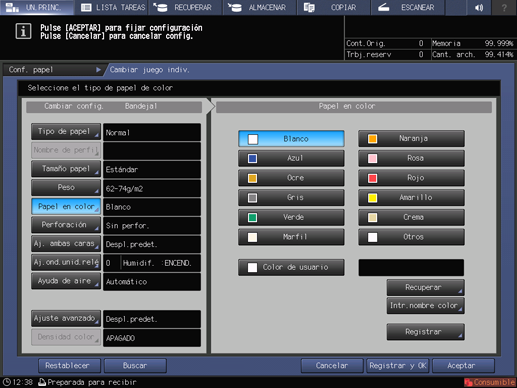 explicación adicionalAl seleccionar Datos aj.reg. se visualiza la pantalla Lista aj.sens.color tipo papel.