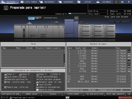 explicación adicionalLas teclas (1) 52-61 g/m2, ( g/m2, (3) 75-80 g/m2, ( g/m2, (10) 257-300 g/m2, ( g/m2y (12) 351-400 g/m2no están disponibles para la bandeja de portadaPB de la unidad de encuadernación PB-503.