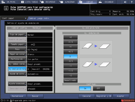 explicación adicionalSi el peso del papel de Especif. color se ha ajustado de 52 g/m2 a 135 g/m2, y el peso del papel de Estucado-GL, Estucado-ML, Estucado-GO, y Estucado-MO se ha ajustado de 81 g/m2 a 135 g/m2, la selección Conf.humi. y On./Off. dejan de estar disponibles.