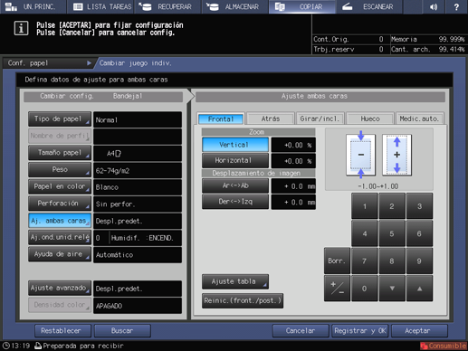 Si cambia la configuración de Zoom, Desplazamiento de imagen, Girar / Inclinar y Ajuste tabla en Frontal o Trasero, o ejecuta el ajuste de Hueco, la indicación de Ajuste ambas caras en la pantalla Cambiar juego individual se cambia a Desp.modificado.