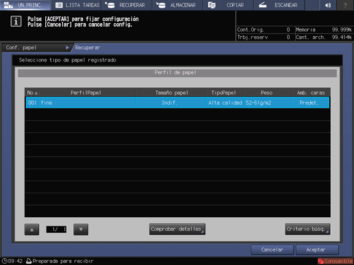 explicación adicionalSi conoce el número de perfil de la condición de papel que desea recuperar, pulse N.º de rec. Puede introducir el número de perfil para recuperar fácilmente el perfil y definir los ajustes.