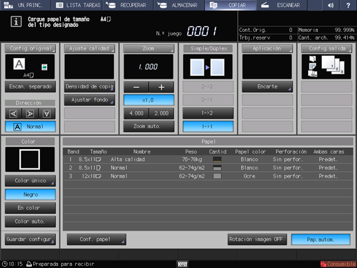 La función Pap.autom. detecta el tamaño del original y selecciona e introduce de manera automática papel de copia del mismo tamaño (x1,0 modo de ampliación), o selecciona el tamaño más adecuado al porcentaje de ampliación seleccionado (modo Zoom).