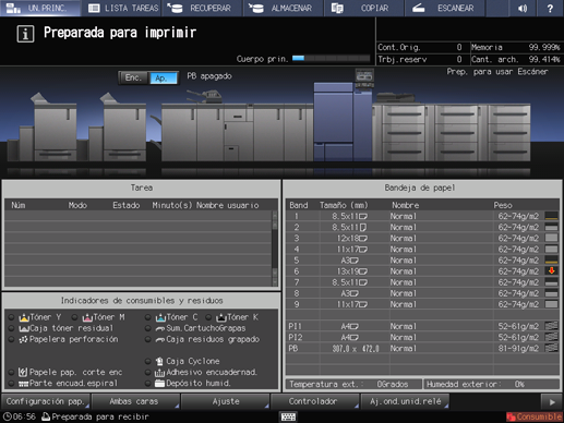 Si ya sabe la hora en la que se va a utilizar la unidad de encuadernación PB‑503, calcule la hora en la que se debe encender el calentador para disponer del tiempo de calentamiento necesario. En este caso, enciéndalo manualmente cambiando la posición del interruptor del calentador de la unidad de encuadernación a Enc. en la pantalla UN.PRINC.