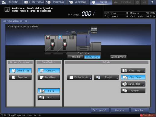 La función Apilador auto. funciona tal como se ha mencionado anteriormente solo cuando no hay problemas en el apilador 1 ni en el apilador 2, cuando no queda papel en el apilador 2 y cuando se ha seleccionado Permitir para la función Conf.pila.