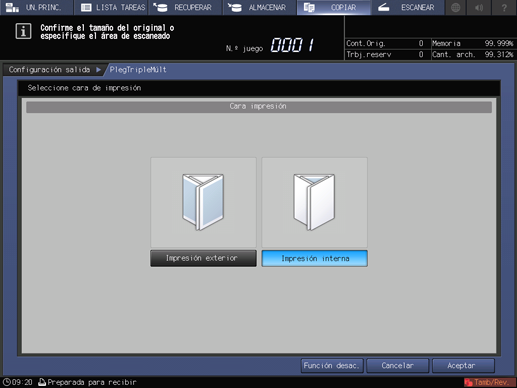 requisito previoEn cuanto al modo Cara, CaraArr. se selecciona automáticamente en combinación con Impresión interna, mientras que CaraAbajo se selecciona en combinación con Impresión exterior.