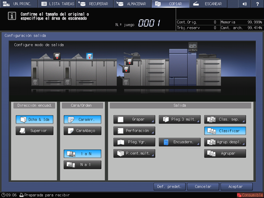 En la pantalla COPIAR de Config.salida, se visualizará un icono que representa el modo de salida especificado.
