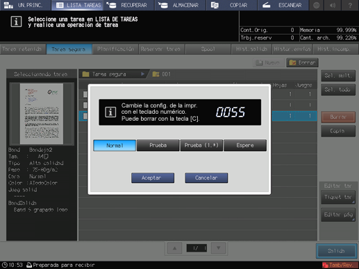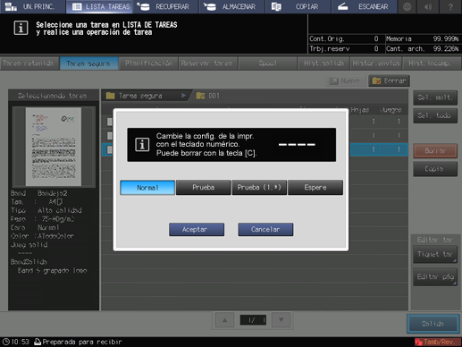 Puede imprimir una tarea segura en la pantalla Tarea segura en el panel táctil de la unidad principal.