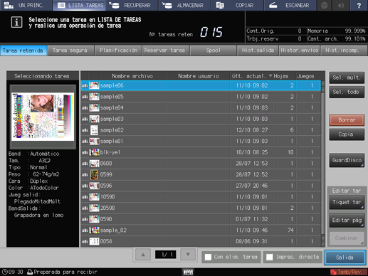 Para obtener más información sobre las funciones de edición de trabajos de la pantalla LISTA TEREAS, como Guardar en disco, consulte Tiquet tar: editar la configuración de impresión de una tarea.