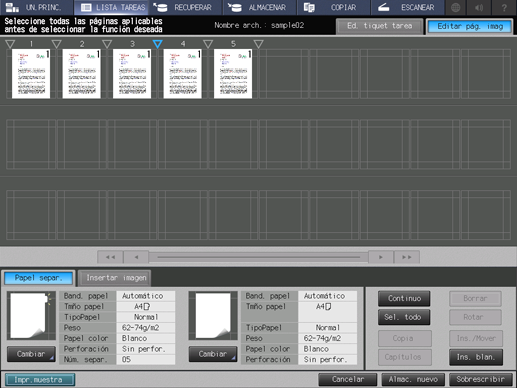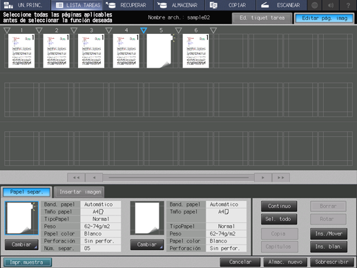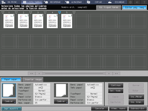 Para realizar la selección, pulse el icono del papel con fichas. Pulse (punto de inserción) de la posición en la que insertar un papel con fichas y pulse Ins./Mover.