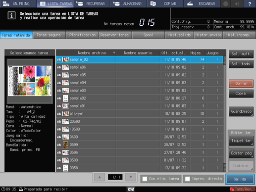 Pulse la ficha LISTA TEREAS en el panel táctil de la unidad principal.