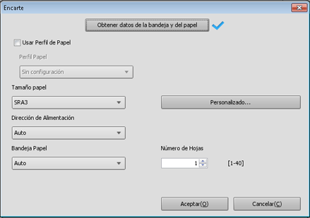 En la pantalla Encarte, especifique el tamaño de papel, la dirección de alimentación y la bandeja de papel, y haga clic en Aceptar.