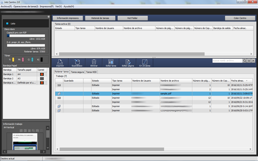 explicación adicionalEn Job Centro, solo puede editar tareas de impresión (el Tipo tarea es Imprimir). Para editar una tarea de copia o de escaneado (Tipo tarea es Copiar), utilice el panel táctil del cuerpo principal.